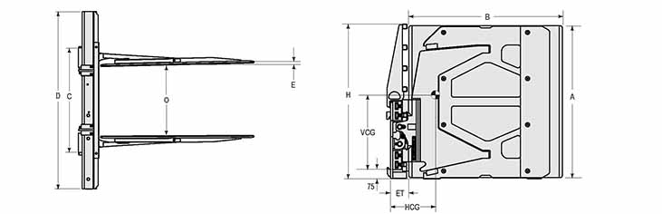 | Capacity 承載能力(kg) | Catalog Order NO 型號(hào) | Mounting Class 安裝等級(jí) | Load Center載荷中心(mm) | Opening Range張臂范圍(mm) | Arm Height臂高A(mm) | Arm Length臂長(zhǎng)B(mm) | Arm Thickness臂厚E(mm) | Overall Width總寬D(mm) | Overall Height總高H(mm) | Vertcial Center Of Gravity垂直重心VCG(mm) | Hook Spread上鉤外側(cè)間距(mm) | Weight 自重(kg) | Effective 失載距ET(mm) | Horizontal Center of Gravity 水平重心CGH(mm) |